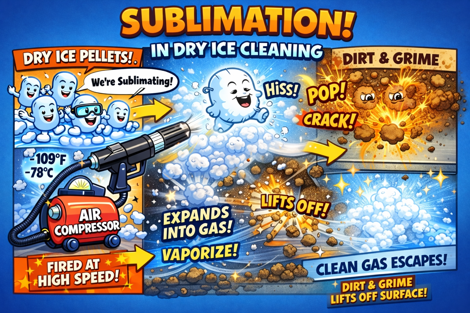 When dry ice hits the surface, it instantly sublimates—expanding up to 800 times in volume. This rapid expansion creates a gentle lifting force that pushes contaminants away from the surface.